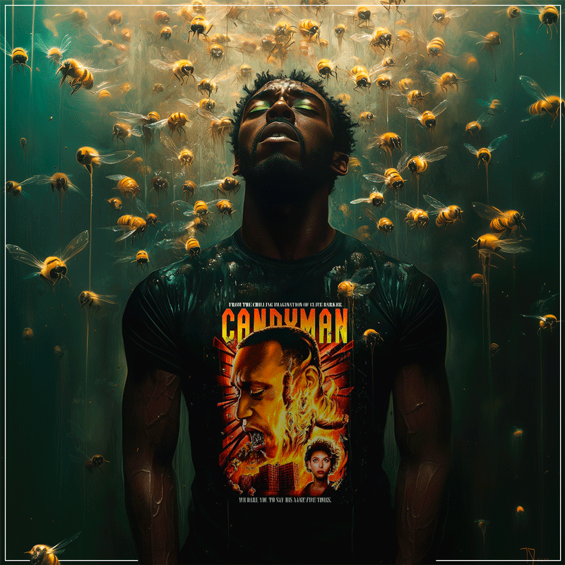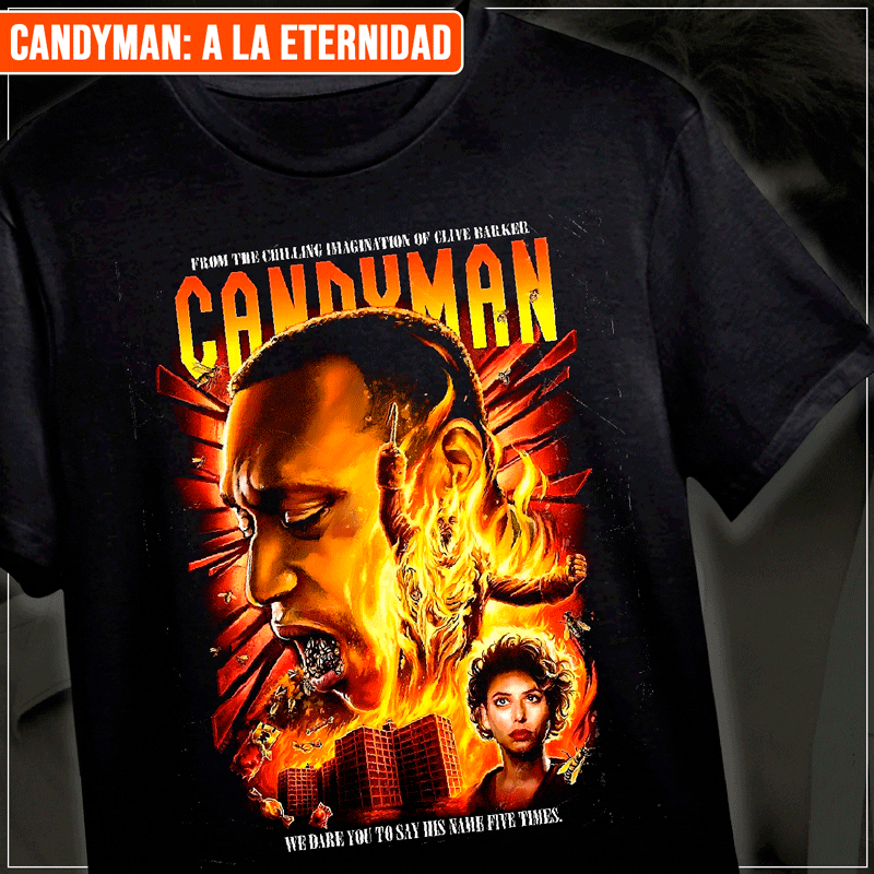 🍬 El diseño es impactante, mostrando a Candyman rodeado de fuego y abejas, una combinación inquietante que captura la esencia de terror psicológico que caracterizó al personaje.