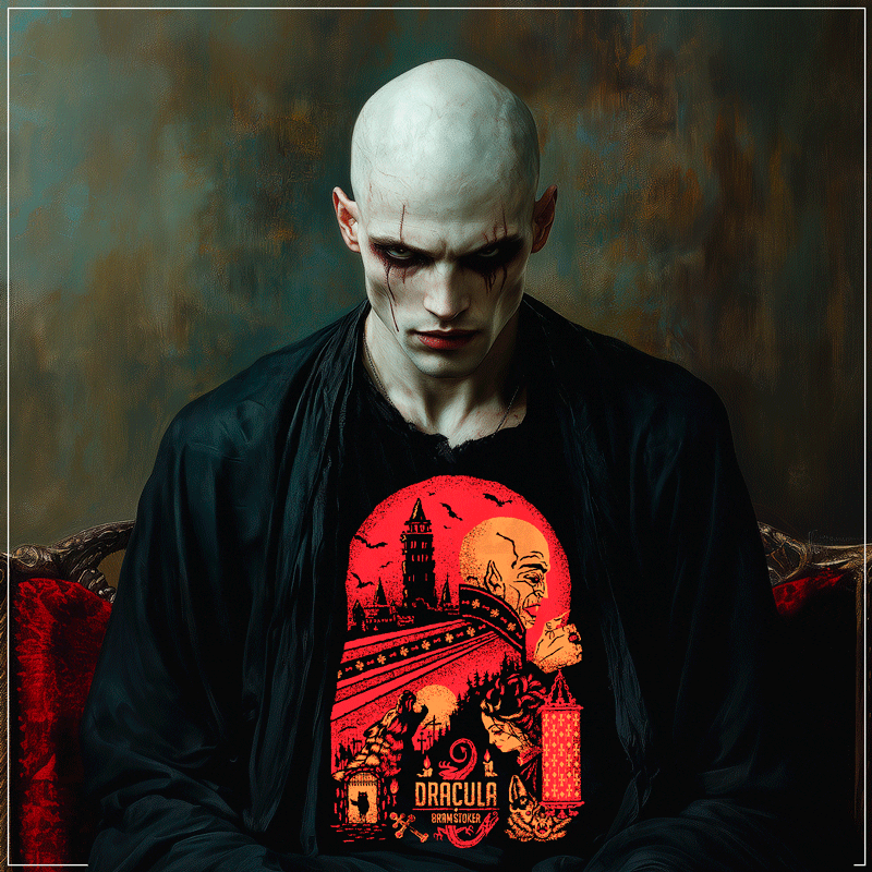 🌕 El diseño en tonos oscuros y rojos intensos evoca la atmósfera sombría del castillo del conde Drácula, acompañado de su mirada hipnótica.